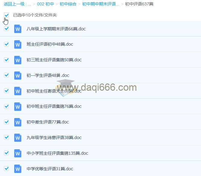 初中班主任期末评语模板大全教师评语范文Word 文档 资源简介: 目录: 初中评语637篇 中学优等生评语31篇.doc 中小学班主任评语集锦135篇.doc 九年级学生诗意评语38篇.doc 八年级...